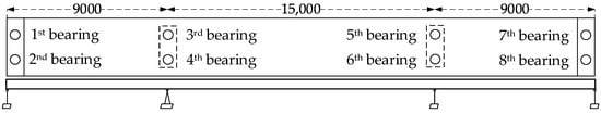 The superstructure consists of a uniformly high steel box girder, using Q345 steel and C30 concrete. Both the top and bottom plates are reinforced with stiffeners, with dimensions of 100 mm × 10 mm. The spacing for the stiffeners on the top plate is 400 mm, while on the bottom plate, it is 350 mm. A finite element model of the three-span continuous girder bridge was established based on the dimensions of the experimental bridge (see Figure 12). The layout of the bearings is shown in Figure 13.