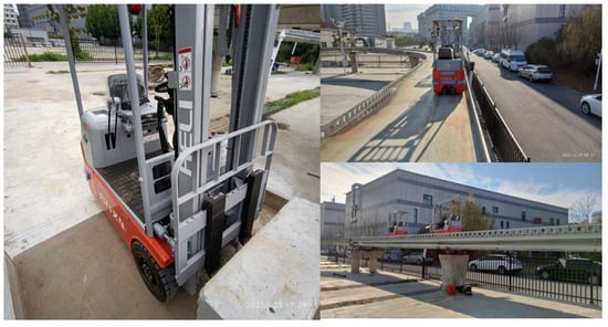 In the experiment, the loading method used was a moving load. Concrete weights were attached to the experimental forklift to simulate a moving load of 20 kN. This setup aimed to analyze the performance of the AIFMB under different loading conditions. It is noteworthy that the wheelbase of the forklift is 1 m, and the distance between the front wheels is 0.8 m. Due to its relatively small wheelbase and track width, it can be approximated as a concentrated load, assuming that it does not induce vehicle axle effects (see Figure 15).