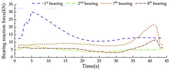 From Figure 16, the BRFs of the first and second bearings show a significant difference during the initial phase of vehicle loading (around the 5-s mark). This difference is caused by the narrow cross-sectional width of the scaled bridge and its ring-shaped structure. When the vehicle enters the bridge, it is not fully centered, creating an eccentric loading effect (refer to Figure 15). As a result, the peak BRF at the first bearing is 30 kN, while the peak BRF at the second bearing is 7 kN. As the vehicle moves forward, its path aligns with the bridge centerline, reducing the eccentric loading effect. Finally, the peak BRFs at the seventh and eighth bearings are 22 kN and 12 kN, respectively.