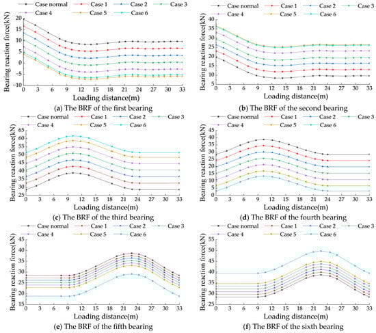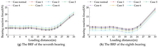 Furthermore, height adjustments for the fourth bearing were conducted under Cases 1 to 6. A moving load of 20 kN was applied to simulate the movement of a vehicle on the bridge deck. The impact of different height adjustments on the AIFMB was analyzed (see Figure 17).