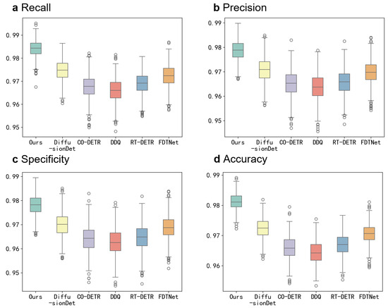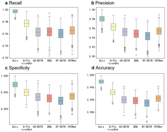To visually demonstrate the superior performance of our proposed model compared with other state-of-the-art (SOTA) models on the CTCH dataset, and to evaluate its consistency across different data distributions during testing, we present boxplots of our method alongside three SOTA models (DiffusionDet, CO-DETR, DDQ, RT-DETR, and FDTNet) on four metrics (recall, precision, specificity, and accuracy) in Figure 4. Bootstrapping was used to generate 1000 resampled independent test sets, simulating performance evaluations under varying data distributions. From the boxplots, we observe that our proposed model not only achieves the highest average performance but also demonstrates the narrowest performance interval across different data distributions. This indicates that our model’s performance is highly consistent, even under varying data conditions, and clearly outperforms other SOTA models in terms of robustness and reliability.