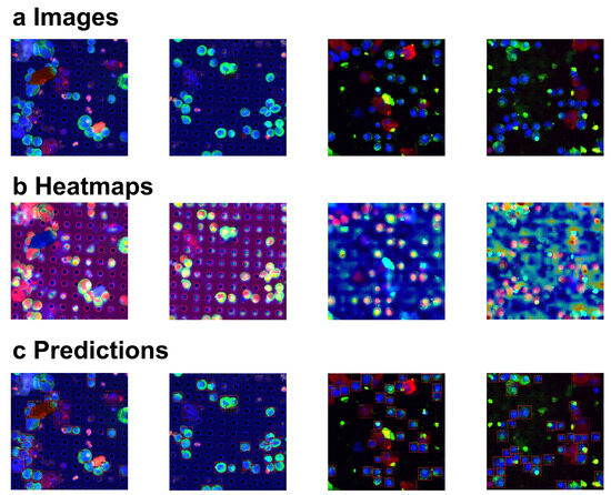In addition to the quantitative experiments, we performed feature heatmap generation and visualization of prediction results for the input images. As illustrated in Figure 5, challenging cases, including multiple overlapping circulating tumor cells (CTCs) and varying image quality, were considered to evaluate the robustness of the method. The heatmaps provide insights into the model’s focus areas, while the prediction outcomes further validate its performance in detecting CTCs, even under complex scenarios with overlapping cells or degraded image quality. These visualizations complement the quantitative results, demonstrating the method’s resilience in diverse imaging conditions.