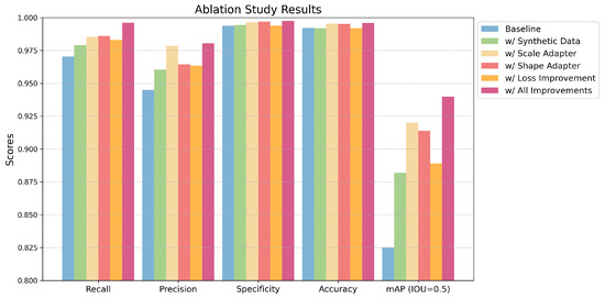 The shape adapter yielded notable gains in recall (0.9860) and specificity (0.9969), with mAP rising to 0.9140 (+8.9%). The improvement in loss, which was addressed simultaneously with the addition of synthetic data to balance the effects of real and generated data, had a moderate impact on mAP (0.8820, +5.7%). Ultimately, the combination of all enhancements achieved the best performance, with mAP reaching 0.9400 (+11.5%) and recall peaking at 0.9961, underscoring the cumulative effectiveness of the proposed modifications.