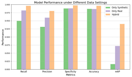 To assess model performance under different data conditions, we compared three training setups: one with only synthetic data, one with only real data, and one with a hybrid dataset. As shown in Figure 8, the hybrid dataset consistently led to the best overall performance across all evaluation metrics. Specifically, while training with synthetic data showed strong results, the real data alone provided even better performance. However, it was the hybrid dataset that delivered the most significant improvements, yielding the highest values in recall, precision, specificity, accuracy, and mAP. These findings highlight the clear advantage of using the hybrid dataset, demonstrating its superior effectiveness in enhancing model learning and feature representation compared with both synthetic and real data alone.