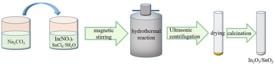 To prepare the In2O3/SnO2 nanocomposites, four groups of solutions, which were 1 mmol SnCl4·5H2O and 4 mmol In(NO3)3; 2 mmol SnCl4·5H2O and 3 mmol In(NO3)3; 3 mmol SnCl4·5H2O and 2 mmol In(NO3)3; and 4 mmol SnCl4·5H2O, 1 mmol In(NO3)3, and 10 mmol NaCO3, were selected and poured into vessels with 100 mL of distilled water. With the same processes used for samples 1# and 6#, four kinds of In2O3/SnO2 nanocomposites with different mol ratios were prepared and marked as 2#, 3#, 4#, and 5#, as shown in Table 1. The nanocomposite preparation process is shown schematically in Figure 1.