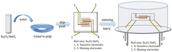 The powders of the above sensitive nanomaterials were put into test tubes, and a moderate amount of deionized water was added to prepare suspensions. A planar ceramic sheet measuring 3 × 3 × 0.25 mm had two sensitive electrodes on one side and heating electrodes on another side. A suspension of sensitive material was manually coated on the sensitive electrodes by drop coating. The sensitive-material coating was heated in an oven at 500 °C for 2 h. Finally, the four pins of the ceramic sheet were welded to the sensor TO packaging with soldering tin. The preparation process is shown in Figure 2.
