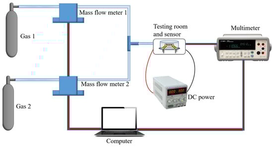 The sensors were tested using a gas distribution system, as shown in Figure 3. Two mass flow meters (Sevenstar CS200A) controlled by a computer provided different flow rates for ethanol and dry air. The mixed gas flowed into the cylindrical gas chamber in which the gas sensor was installed at 200 sccm (standard cubic centimeters per minute). A DC power supply was used to apply a voltage to the two heating electrodes, providing working temperatures for the gas sensor. The resistance between the two sensitive electrodes of the gas sensor was monitored by a digital multimeter (Agilent 34970 A). For the gas sensor, the resistance between the two sensitive electrodes in pure air was Ra, the resistance in an atmosphere with the target gas was Rg, and the response of the sensor based on an n-type metal oxide was defined using Equation (1).