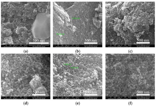 The prepared materials were then characterized and analyzed in different ways. FESEM (field emission scanning electron microscopy) images were obtained on a Quanta 250FEG microscope with an operating voltage of 20 kV. As shown in Figure 4, the In2O3, SnO2, and In2O3/SnO2 composites were irregular nanoparticles with diameters of about 10 nm. The same 500 nm scale bar is used for all images. Some of the particles were clustered together, most of them showed bumpy surfaces, and the sizes of several of the more obvious nanoparticles were measured (about ten nm to tens of nm).