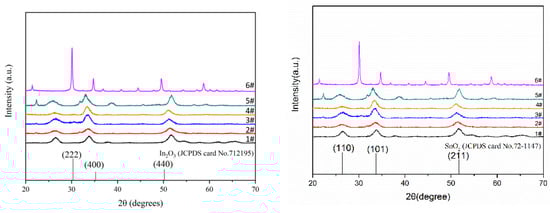 The XRD (X-ray diffraction) patterns of the In2O3, SnO2, and In2O3/SnO2 composites are shown in Figure 5. They were obtained using a Bruker D8 ADVANC instrument (Cu Kα, 2.2 kW, λ = 1.54056 Å) at 2θ from 20° to 70°. The angles of the main characteristic peaks were observed at 2θ values of 30.63°, 35.54°, and 51.04°, which corresponded to the (222), (400), and (440) planes, respectively, when compared with an In2O3 standard card (JCPDS71-2195). The material belonged to a cubic crystal-type iron manganese ore type with an average grain size of 29 nm. The SnO2 pattern was compared with the standard card JCPDS72-1147, and the angles of the main characteristic peaks were observed at 2θ values of 26.57°, 33.92°, and 51.74°, which corresponded to the (110), (101), and (211) planes. The crystal type was a tetragonal rutile type, and the average grain size was 6 nm. Figure 5 shows that the peak was obvious during the detection of pure In2O3. When SnO2 was present, the corresponding peak was covered, probably because of the small content of In2O3. Finally, the curve of the composite material only had a relatively obvious peak of SnO2. It is also possible that the In2O3 in the composite material existed in the interior of the SnO2, making the curve of the SnO2 more obvious.