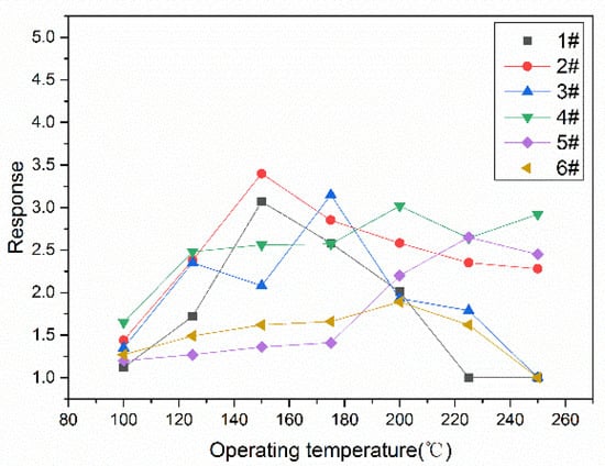 Next, a series of gas-sensitive performance tests were performed on the sensors. Figure 6 describes the relations between the responses and the operating temperatures of the In2O3/SnO2 sensors for 1 ppm ethanol at operating temperatures ranging from 100 °C to 250 °C. The resistances of all sensors changed at different operating temperature values, and the reason for the resistance changes induced by the changes in the sensor materials at the same operating temperatures was the n-n heterojunction. The responses of the sensors reached their maximum values at their optimal operating temperatures. The optimal operating temperature of In2O3/SnO2 sensor sample 2# was 150 °C, as shown in Figure 6.