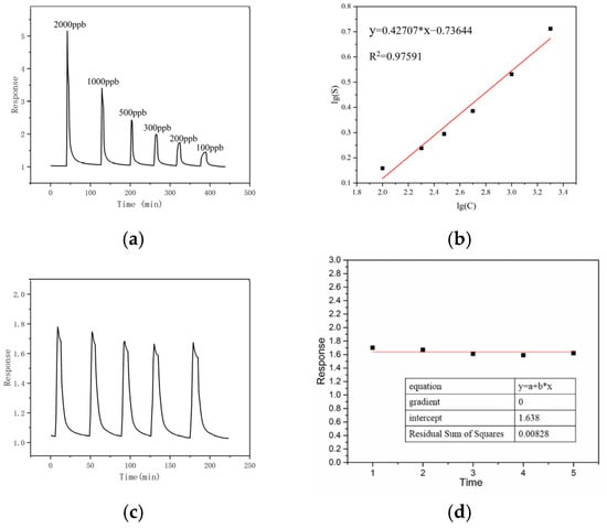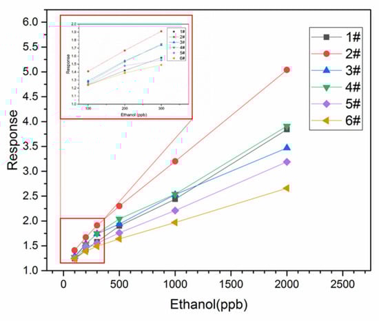 The responses of the sensors to ethanol from 100 ppb to 2000 ppb were tested at the optimal operating temperature, as shown in Figure 7. The responses of all sensors increased with increasing concentrations, and sample 2# had the highest response of all sensors.