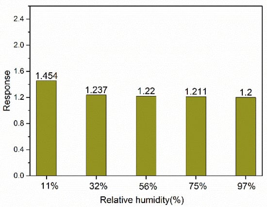 The previous tests showed that sample 2# performed best. As shown in Figure 8, sensor 2# had an obvious response to a low concentration of ethanol and had good repeatability. The response of the In2O3/SnO2 sensor to 100 ppb ethanol was 1.41, while the response of the pure In2O3 sensor to 100 ppb ethanol was 1.21. The baseline resistance and the resistances of In2O3/SnO2 sensor 2# to 200 ppb ethanol at different relative humidities at 150 °C are shown in Figure 9. The sensors can also work in a humid environment.