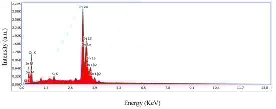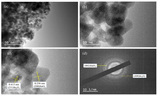 Figure 10 shows the distribution of the O, Sn, and In elements in the sample 2# In2O3/SnO2 nanocomposite based on EDS (energy-dispersive spectroscopy). Figure 11 shows the sample 2# In2O3/SnO2 nanocomposite as characterized by a JEOL JEM-2100 TEM (transmission electron microscope). As shown in Figure 11, at a higher magnification, the nanocomposite can be clearly seen as a particle with a diameter of about 10 nm. The two metal oxides are evenly distributed in the picture. As shown in Figure 11c, a d-spacing of 0.236 nm was attributed to the SnO2 (200) plane and 0.413 nm was assigned to the (211) plane of In2O3. Figure 11d shows the SAED (selected-area electron diffraction) patterns of In2O3/SnO2.