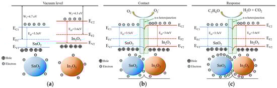 Schematic diagrams and energy band structures of the In2O3/SnO2 nanocomposite: (a) before contact; (b) in air; and (c) in ethanol.