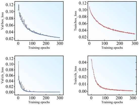 Loss plays an important role in the training process, which reflects the relationship between the true value and the predicted value. The smaller the loss is, the closer prediction value is to the true value, and the better performance of the model. The meticulous training journey and parameter optimization efforts of the network are detailed and visualized in Figure 8. Upon the completion of each training epoch, the model’s performance was rigorously assessed against the validation set. This evaluation encompassed a suite of metrics: bounding box loss (box_loss), mean value of objectiveness loss (obj_loss), classification loss (cls_loss). The localization loss quantified the deviation of the predicted bounding boxes from the ground truth, employing the Mean Squared Error for computation. The confidence loss evaluated the network’s certainty in its predictions, whereas the classification loss, determined by the Cross-Entropy Loss, gauged the difference between the predicted and actual categories. Together, these metrics provided a comprehensive view of the model’s accuracy and predictive abilities at each stage of training. As illustrated in Figure 8, the box_loss, obj_loss and cls_loss for both the training and validation sets exhibit a downward trend, eventually reaching a stable state and converging to a lower loss. For the three index in the validation set, the utilized model is 0.022, 0.001, and 0.009, respectively, at 300 epochs.