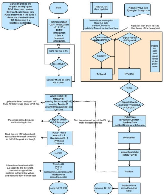 The general idea of the program is that the pulse renderer records the voltage waveform signal of the pulse based on the returned light. The program uses QS to determine if a heartbeat is detected. The voltage signal is sampled and converted to a digital signal by a microcontroller, which then sends the signal to the host computer for recording and displaying. The microcontroller calculates the time difference between two adjacent pulse wave crest points, which corresponds to the time interval between two heartbeats, known as the Inter-Beat Interval (IBI).