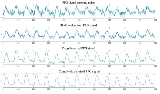 Considering that the wavelet bases should exhibit regularity and symmetry, double orthogonal wavelets are employed to eliminate baseline drift and industrial frequency interference. The pulse wave signal is decomposed into 9 scale wavelets using the Bior6.8 wavelet. The soft threshold function is utilized with the threshold calculated based on the maximum–minimum criterion. The wavelet coefficients for scales 1, 2, and 3 are set to zero, while the low-frequency approximation signal of scale 9 is filtered out. The reconstructed signal obtained from the pulse wave signal is illustrated in Figure 2. As shown in the figure, the denoised pulse wave signal effectively reduces the baseline drift, motion artifacts, and industrial frequency interference.