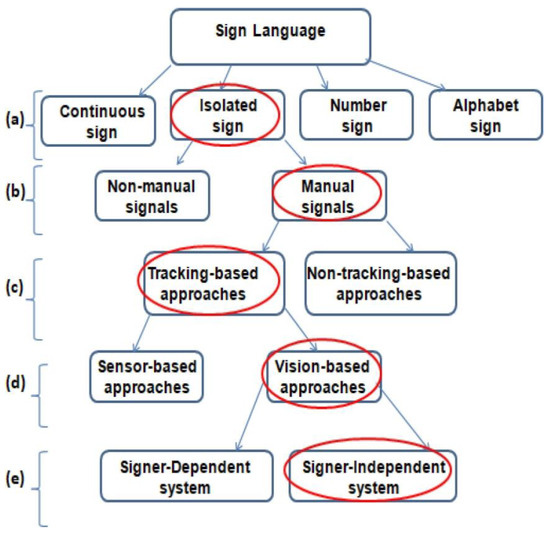 Study context: (a) sign categories, (b) sign characteristics, (c) sign detection techniques, (d) sign data acquisition approaches, and (e) sign classification conditions [4]. The red circles highlight the key focus areas of our study within the hierarchy of sign language recognition.