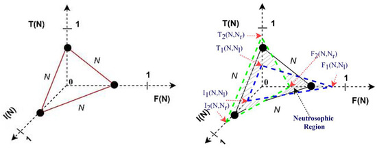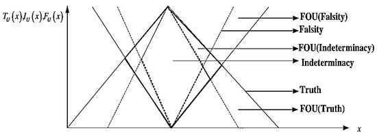 Formally, a single-valued neutrosophic set (SVNS) on universal set U is characterized by truth membership function , indeterminacy membership function and falsity membership function , respectively, in the following way [10,11]: