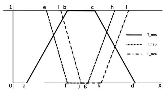 T2NL is an advanced framework for dealing with uncertainty, imprecision, vagueness, and inconsistency. This approach provides a more flexible and precise method for handling higher levels of uncertainty and complex information. A neutrosophic set is characterized by three functions: truth membership (T), indeterminacy membership (I), and falsity membership (F). In T2NL, these functions are not single values but ranges (intervals). Truth (T) represents the degree to which an element is true. In Type-2 Neutrosophic Logic, it is an interval . Indeterminacy (I) represents the degree of indeterminacy or uncertainty. It is an interval . Falsity (F) represents the degree to which an element is false. It is an interval . A Type-2 neutrosophic set A in a universe of discourse X is defined as . In our case, a linear trapezoidal neutrosophic number, as illustrated in Figure 4, is used that is defined as [32]