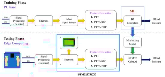 Figure 1 shows the flowchart of this study. BCG and IPG signals were measured from a bodily weight-fat scale, which were filtered by the infinite impulse response filters to remove the baseline and noise. The signals were segmented for the feature extraction. In the training phase, all samples were used to build a model in server-based computing to estimate BP. Then, the hyperparameters of the model would be limited to let the memory size fit the resources of the STM32F756ZG NUCLEO development board. In the testing phase, the signals were fed into this edging computing system to estimate BP and show them in a graphic liquid crystal display (LCD) in real time. The sampling rate is 500 Hz.