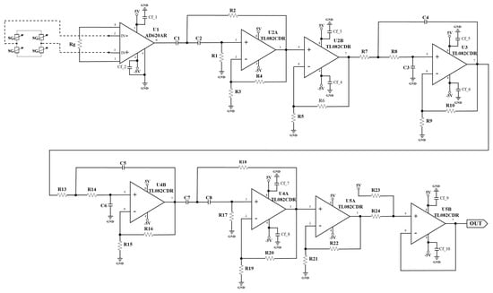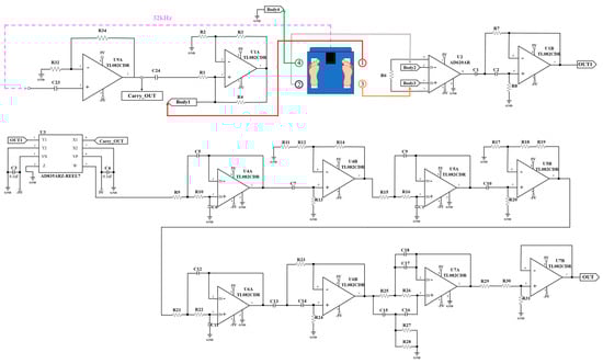 We designed the circuits to measure BCG and IPG signals from the strain gauges and electrode pads of the bodily weight-fat scale. Figure 2 shows the BCG schematic which used two strain gauges to detect the BCG signal. U1 (AD620, Analog Device, Norwood City, OH, USA) is an instrument amplifier, U2A (TL082, Texas Instruments, Dallas City, TX, USA) and U4A (TL082) are two second-order Butterworth high pass filters, where the cutoff frequency is 0.5 Hz, and U3 (TL082) and U4B are a fourth-order Butterworth low pass filter, where the cutoff frequency is 20 Hz. U2B and U5A (TL082) are two noninverted amplifiers, which all gain 500. U5B is a baseline shift, whose output is the BCG signal. Figure 3 shows the IPG schematic which used four electrode pads to feed the fixed alternated current into the body and extract the potential voltage of body. An oscillation frequency (32 kHz) is generated by the crystal of the bodily weight-fat scale, which is inputted into the circuit (U1A, TL082) of the fixed current source and demodulator (U3, AD835). U9A (TL082) is a voltage follower. The fixed current is inputted into the first pad. The fourth pad is the ground. The potential voltage is extracted from the second and third pads. U2 (AD620) is an instrument amplifier (AD620), and U1B is a second-order Butterworth high pass filter (0.3 Hz of cutoff frequency) to remove the baseline voltage, which is demodulated by U3. Then, U4A (TL082), U5A (TL082), and U6A (TL082) are three second-order Butterworth low pass filters, where the cutoff frequency is 10 Hz. U4B and U5B are the noninverted amplifiers, which all gain 500. U6B is also a second-order Butterworth high pass filter. U7A is a two-pole notch filter, where the stop frequency is 60 Hz. U7B is a baseline shift, where output is the IPG signal.