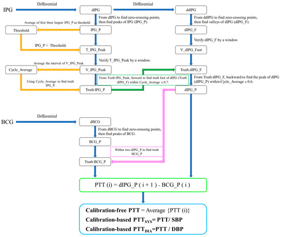 The flowchart of calibration-free PTT and calibration-based PTT measurement from BCG and IPG.