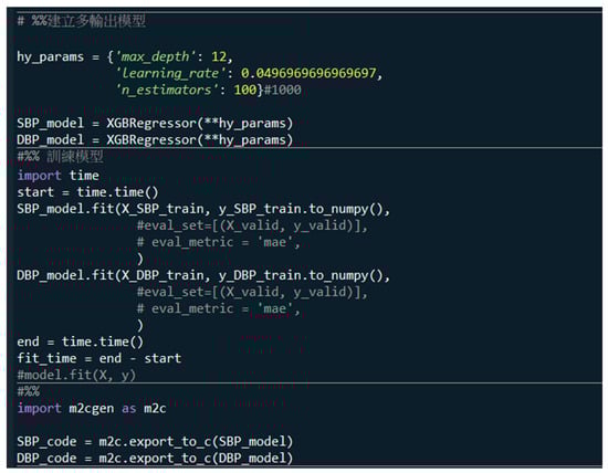 In a server-based computing system, the format of the trained model could be .pb, .onnx, kept, tflite, or .h5. However, these formats cannot be directly imported into the microcontroller, so a special conversion of the format is required. When training the model, we use the m2cgen (Model 2 Code Generator) function library to convert the XGBoost model as C code, as shown in Figure 5. The last three comments convert the estimation models of SBP and DBP as C-code models. First, we import the m2cgen tool, “import m2cgen as m2c”. Then, we export C-code models of SBP and DBP estimation as SBP_code and DBP_code, “SBP_code = m2c.export_to_c(SBP_model)” and “DBP_code = m2.export_to_c(DBP_model)”.
