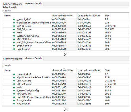 The flash memory information of STM32F756ZG microcontroller. (a) XGBoost with 80 trees; the memories of SBP and DBP models are 339.77 Kbytes and 350.3 Kbytes, respectively. (b) XGBoost with 70 trees; the memories of SBP and DBP models are 240.36 Kbytes and 276.68 Kbytes, respectively.