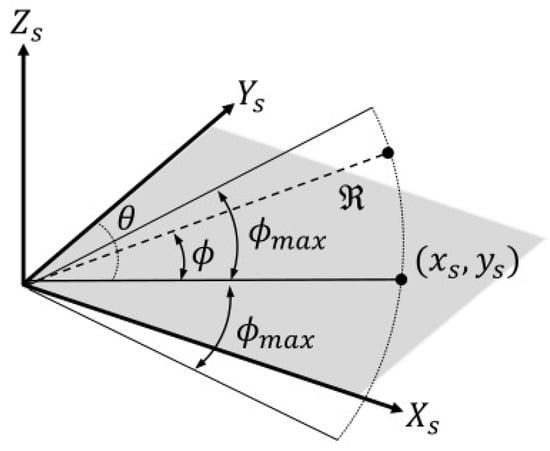 In the acoustic camera coordinate system, a point on the image plane that is coplanar with the plane formed by the x- and y-axes of the acoustic camera coordinate system is determined solely by the range and azimuth angle (see Figure 2), where is the maximum elevation angle at which acoustic waves can be radiated from the acoustic camera.