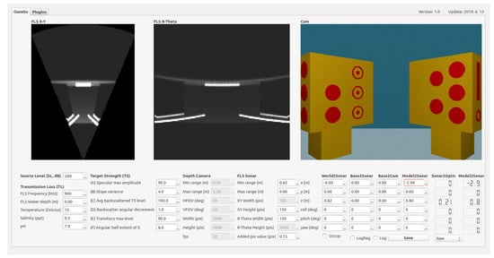 The 3-D point clouds are generated using a depth camera plugin that leverages the ray-casting engine of the Gazebo simulator. A graphical user interface (GUI) is integrated with the simulator, allowing real-time monitoring of acoustic images and real-time control of all parameters related to the depth camera and sonar equations (see Figure 4). Additionally, various types of noise can be applied to the acoustic images. The overall procedure is summarized in Algorithm 1.