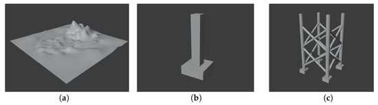 The dimensions of the three models are as follows: the seabed model has 10 m in length, 10 m in width, and 2 m in height; the bridge pier model has 4 m in length, 4 m in width, and 9.5 m in height; and the jacket model has 5 m in length, 5 m in width, and 8.5 m in height. While the sizes and shapes of these models may differ from their real-world counterparts, this discrepancy does not affect the trends in simulation performance.