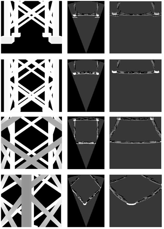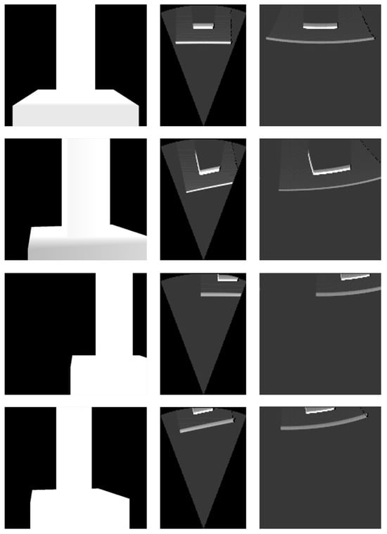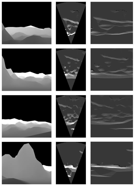 Each column in Figure 6 shows a depth image and two types of acoustic images generated by the simulator. The images in each row were obtained from the same camera position in the simulator. In the third column, the images use the horizontal axis to represent azimuth angle and the vertical axis to represent range. The images in the second column align the vertical axis with the Y-axis and the horizontal axis with the X-axis in Figure 1, with both axes measured in meters.