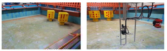 One acoustic camera and two optical cameras were mounted together on a frame that can move forward, backward, left, and right at a fixed height. The viewing axes of the acoustic camera and one of the optical cameras are parallel to the bottom surface of the test tank. The remaining optical camera was positioned with its viewing axis perpendicular to the bottom of the tank. To determine the positions of the cameras within the tank, artificial visual markers were placed on the bottom and photographed.