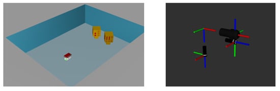 The Gazebo simulator simulated the components and settings of the experimental environment where the actual images were acquired (see Figure 10). The parameters for simulating the acoustic images were set based on the specifications of the actual acoustic camera, the Teledyne BlueView P900-45, summarized in Table 5. The simulated images were acquired at the same location as the actual images, and no acoustic noise was applied.