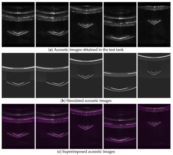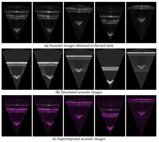 Comparison of acoustic images that use the horizontal axis for azimuth angle and the vertical axis for range: (a) Acoustic images obtained in the test tank; (b) simulated acoustic images; (c) superimposed acoustic images.