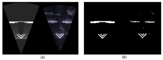 Three sets of acoustic images were acquired from the test tank. The real acoustic images suffered from significant noise due to the enclosed environment of the test tank (see Figure 11a and Figure 12a). Consequently, multiple reflections of the acoustic waves were observed in the images, and shadow areas that are typically visible in high-performance acoustic cameras were partially identifiable. The simulated images clearly displayed the shadow areas and were generated at a rate of approximately 15 Hz, which is similar to the actual acoustic camera (see Figure 11b and Figure 12b).