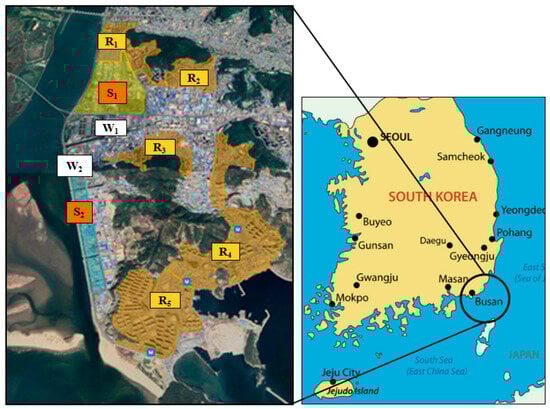 Location of Busan City in South Korea and the Sinpyeong Jangrim Industrial Complex (S1 and S2), residential areas (R1–R5), and installed anemometers (W1 and W2). The purple spots indicate other industrial areas near the observation site.