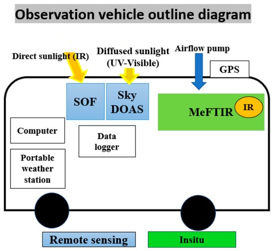In this study, a mobile vehicle equipped with in situ and remote sensing technology was used, including SOF, SkyDOAS, and MeFTIR as measurement techniques. The data presented in this paper were acquired using the DOAS and SOF methods, both leveraging similar principles to capture the total fluxes of industrial emission plumes rather than mere concentrations. These techniques employ open-path absorption spectroscopy to measure column concentrations, with the primary difference lying in their spectroscopic approaches. Mobile DOAS relies on ultraviolet (UV) measurements of scattered sunlight [13], whereas SOF is based on infrared (IR) measurements of direct sunlight [14]. The technology utilized in this study provides real-time alerts to communities located downwind, enhances existing emission inventory estimates, accurately measures facility-wide emissions, improves the effectiveness of regulatory policies, and showcases the feasibility and effectiveness of fence line monitoring using optical remote sensing. Fence line monitoring is a method that integrates measurement data and wind information at the boundary of a specific area to estimate the amount of emitted pollutants within that area. This method is commonly used in locations such as oil refineries, where leaks can occur from pipes and tanks. Recently, the United States Environmental Protection Agency (EPA) has been expanding the use of fence line monitoring for benzene emissions (e.g., the benzene fence line monitoring program of the U.S. EPA) [15]. In fence line monitoring, more frequent observations across various times of the day would strengthen the representativeness of the data for that day. However, depending on the weather situation and sunlight altitude, the measurement period might differ from one day to another. In general, conducting a full measurement four times around the defined boundary provides a good representation of the emitted pollutants over that area and can represent the daily average values. In this study, to ensure precise measurement, at least four full measurements were conducted daily from nearly 8:00 a.m. to 3:00 p.m. (as long as the sun was trackable). Since the influence of light scattering by solid or liquid particles in the atmosphere is important, especially near industrial complexes, to minimize the impact of scattering, measurements were conducted during periods of clear atmospheric conditions whenever possible. In addition, baseline spectra were recorded in upwind regions of the industrial complexes, where pollutant concentrations were expected to be minimal. These spectra were used to correct for baseline deviations caused by scattering effects. Also, any measurements potentially influenced by heavy particulate loads (e.g., during haze or fog) were excluded from the final calculations. This was complemented by cross-referencing with meteorological data, including visibility and particulate matter levels, when available. Figure 3 illustrates the measurement vehicle diagram and other sections in depth.