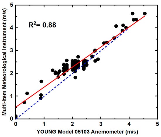 To assess the performance of the two anemometers, a two-hour comparison test was conducted with both devices placed in the same location, and data were collected for analysis. Figure 4 illustrates the coefficient of determination (R2) between the Multi-item Meteorological Instrument and the YOUNG Model 05103 Anemometer throughout the comparison test. The R2 value of 0.88 indicates a strong correlation between the measured wind speeds by the two anemometers. Additionally, the results revealed that the wind speed recorded by the Multi-item Meteorological Instrument was approximately 10% higher than that of the other anemometer. As a result, only the wind speed measured by the Multi-item Meteorological Instrument was adjusted and utilized in this study following the identified discrepancy during the comparison test. The wind speed observation range, wind direction specification, and analysis interval for the Multi-item Meteorological Instrument were approximately 0–50 m/s, 0–360°, and 1 min, respectively. To ensure precise wind direction and speed data, this anemometer was positioned at heights matching those of the observation vehicle near the observation site.