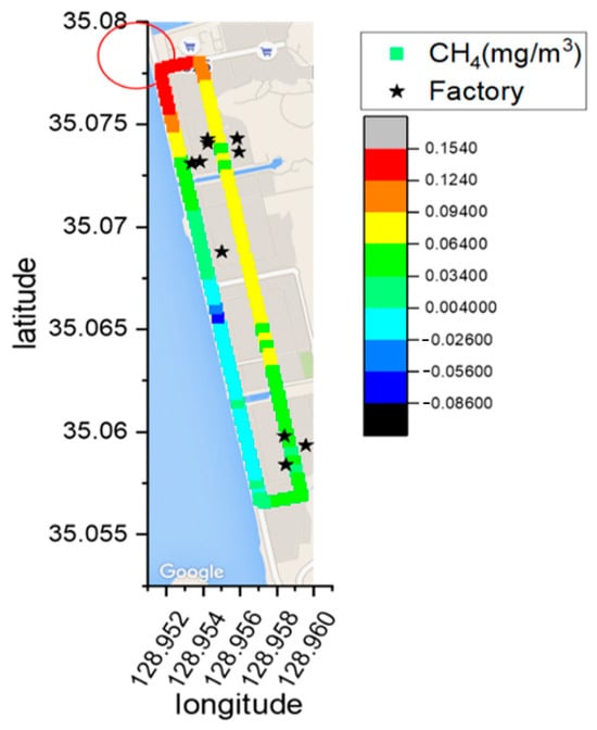 In determining the emission source, the observed column concentrations were spatially represented on a map, considering the average wind speed and direction for each measurement. To visualize emission locations, an initial map of the measurement area was created, aiding in pinpointing areas with elevated concentrations. Utilizing the GPS inside the mobile measurement vehicle, the latitude, longitude, and concentration data were overlaid on the map. The concentration gradient was categorized into 8 levels; areas with higher concentrations were depicted in progressively redder hues. To better understand the measurement method, Figure 5 illustrates the defined fence line and measurement principles for CH4 measurement in zone S2 of the Sinpyeong Jangrim Industrial Complex within one day of measurement. The red circle at the top of Figure 5 indicates the anticipated source of CH4 emissions in zone S2, as determined by the measurement results.