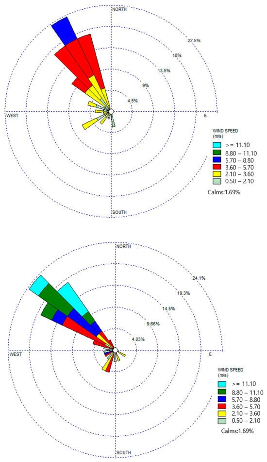 Figure 6 shows the primary wind directions observed during the measurement days in zones S1 and S2. The dominant wind direction, as depicted in Figure 6, was predominantly northwesterly for both anemometers. Furthermore, the wind direction exhibited consistent alignment within a 5% margin for both devices. In zone S1, the wind speed generally exceeded 2.1 m/s, while in zone S2, it typically surpassed 3.6 m/s throughout the measurement period. Overall, the average wind speed recorded in zone S2 exceeded that of zone S1, indicating varying wind characteristics between the two zones.