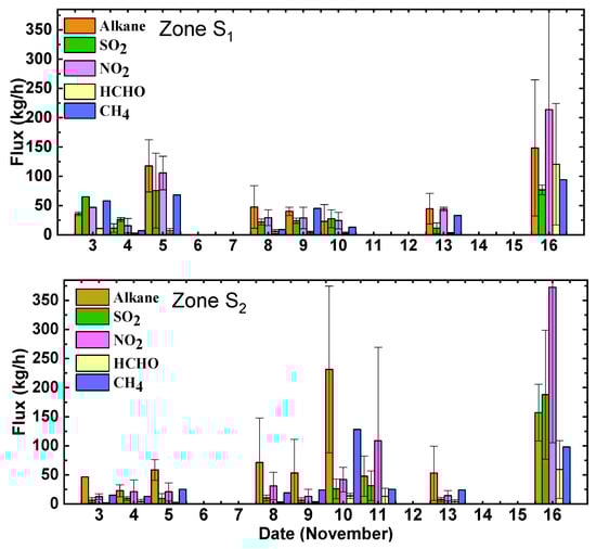 In zone S1, the average wind speed and the wind speed range measured by the installed anemometer were 2.7 ± 0.3 m/s and 1.5 to 4.4 m/s during the entire period of measurement, respectively. According to the measurement equipment principles, the minimum wind speed for accurate optical remote sensing observation must be 1.5 m/s or more, and the observation accuracy might be reduced with a stable atmospheric condition or low wind speed. The lowest wind speed was measured on 16 November (1.7 ± 0.2 m/s), which was accompanied by the highest levels of pollutants due to the atmospheric stagnation and low wind speed. The lowest levels of pollutants were found on 4, 8, 9, and 10 November, with the highest wind speed on 9 and 4 November (4.1 ± 0.3 m/s and 3.7 ± 0.3 m/s), respectively, which can emphasize the role of the wind speed in the reduction in air pollutants. During whole days of measurement, the average flux of total alkanes, SO2, NO2, HCHO, and CH4 was 69.9 ± 91.6 kg/h, 36.4 ± 31.6 kg/h, 64.8 ± 100.8 kg/h, 21.2 ± 54 kg/h, and 41.0 ± 33.0 kg/h, respectively. However, regarding the average daily flux variations, all the measured pollutants showed a high emission flux on Nov 16th.