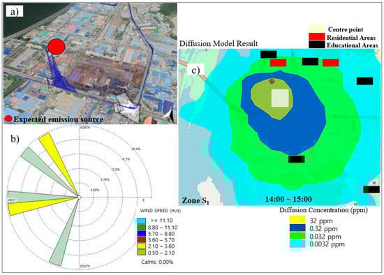 In this study, the emission height and time were assumed to be between 10 and 50 m and 1 h, respectively. This allowed us to estimate the pollutants’ diffusion path and concentration after 1 h. An et al. [27] showed that the direction of a particle’s movements according to the wind characteristics is well identified using the HYSPLIT diffusion model.