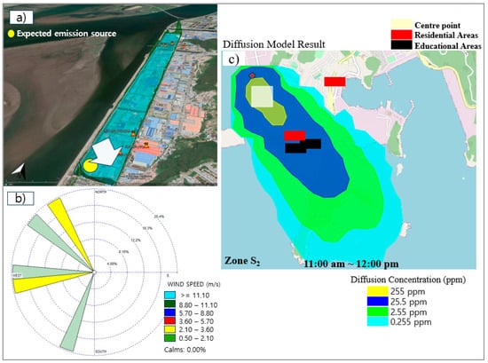 Figure 11 represents the expected emission source according to the observed peak, wind speed, wind direction, and NO2 dispersion estimation based on the HYSPLIT diffusion model in zone S2 (16 November 2020, at 10:41 a.m. and 12:00 p.m.). As is shown, a peak was observed on the south side of zone S2, demonstrating the location of the expected NO2 emission source. In addition, the wind speed was estimated to be less than 3.0 m/s, with the dominant direction of northwest and west. The HYSPLIT diffusion model result confirmed that the downwind residential areas were influenced by NO2 emission pollution with values less than 25.5 ppm. For NO2, when the measured average emission flux was 254.6 ± 65.0 kg/h at the time of observation, in the adjacent residential areas, the average estimated emission was approximately 0.25 to 25.5 ppm according to the HYSPLIT diffusion model estimation.