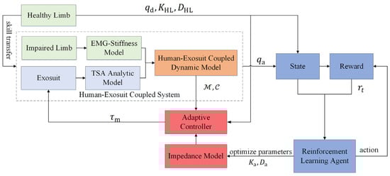 The proposed exosuit is a typical human-robot coupled system that requires highly coordinated movements with the human body, thereby improving wearing comfort and assistance effectiveness. To obtain the optimal assistance strategy of the exosuit for hemiplegic patients, an adaptive impedance control with RL is proposed in a dual-loop structure, and the control diagram is illustrated as in Figure 3. An impedance controller is designed at the inner loop to drive the robotic joint position to track the desired trajectory while considering the subjective performance. A concept of mirror training is introduced herein, and the target of the inner-loop controller is to make the IL to follow the HL’s motion. At the outer-loop, an RL-based strategy is proposed to optimize the robotic assistance while minimizing the wearer’s voluntary effort, and the impedance parameters are optimized by employing an RL algorithm.
