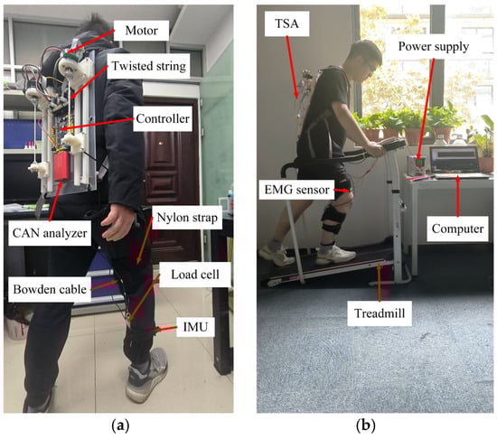 A soft exoskeleton is designed to provide hemiplegic patients with knee joint assistance, and its design scheme is presented in Figure 1. TSAs are developed to transmit actuation force to the wearer’s knee joint. The TSA is composed of a motor, a twisted string, and a Bowden cable. When the motor works, the rotation of the motor causes multiple strands to be twisted with each other to constitute the twisted string. As the Bowden cable consists of an outer cable sheath and an inner steel wire, the tendon force is then used to drive the steel wire through a connecting ring. An upper and lower exoskeleton is used to brace the wearer’s thigh and shank with Nylon straps, respectively. The cable sheath is fixed on the upper flexible exoskeleton, and the distal end of the steel wire is connected to the anchor point at the lower flexible exoskeleton. Therefore, once the TSA works and the Bowden cable is tensed, the contracting force between the upper and lower flexible exoskeleton is exerted to provide assistance torque on the knee joint. Generally, two TSAs work collaboratively to drive the flexion and extension of the knee joint. A spring is installed inside the sliding track, storing and releasing the energy during the untwisting process to counteract the hysteresis. The TSAs, along with driver boards and a controller, are equipped at the backpack of the wearer. More details of the exosuit design can refer to the previous studies [9]. The TSAs are equipped at the backpack of the wearer. A load cell is connected in series with the Bowden cable to measure the tension force. Importantly, in response to the specific requirements of various patients, the TSA can modify its stiffness to provide appropriate assistance.