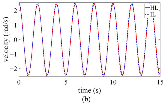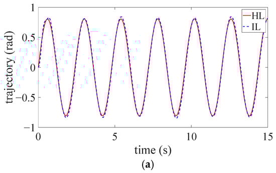 During the experiments, the HL’s movement is assumed as the desired trajectory for controller design, and the IL completes the prescribed walking gait with the assistance of the exosuit. Three tests are conducted to record the mean values. The HL’s trajectory position () and IL’s trajectory position () are depicted in Figure 5a, and the HL’s trajectory velocity () and IL’s trajectory velocity () are depicted in Figure 5b. It can be seen in the figures that the trajectory position and velocity tracking errors are quite small (0.06 rad and 0.11 rad/s, respectively). Due to the factors such as unmodeled uncertainties, measurement errors, and subject variance, the actual trajectory cannot perfectly track the desired trajectory. Generally, the trajectory position and velocity tracking performance are both favorable. As the human-exosuit interaction training processes, the proposed RL algorithm can achieve optimal parameters for the impedance controller to realize accurate bilateral trajectory tracking. In this regard, the user can autonomously master the motion of the impaired IL by his/her own HL, and the training safety can thus be guaranteed.