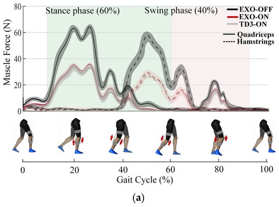 Human joint impedance is vital to evaluate the performance of the proposed controller. In the proposed skill transfer strategy, in addition to the movement trajectory, the HL’s stiffness is also transferred to the IL with the assistance of the exosuit. The voluntary muscle forces of a pair of agonist and antagonist muscles, i.e., quadriceps and hamstrings, are captured by the EMG signals. The experiments are carried out under three different conditions: (a) wearing the exosuit without activating it (EXO-OFF); (b) activating the exosuit without the proposed controller (EXO-ON); (c) activating the exosuit with the proposed controller (TD3 ON). Particularly, in the EXO-ON condition, the RL algorithm is not employed by the fixed impedance parameters. Participants rested for at least 10 min before each test to reduce the effects of fatigue. The muscle forces in the three conditions are shown in Figure 6. During the stance and swing phases of a complete walking gait, the muscle force is reduced by 64.9% and 40.4% in the TD3-ON condition compared with the EXO-OFF condition, respectively. Although the muscle force saving in the EXO-ON condition is decent, the introduction of the RL algorithm can greatly enhance the assistance effectiveness. Also, the stiffness profiles are illustrated, and the tracking performance between the HL and IL is satisfactory, which indicates that the proposed skill transfer strategy can make the IL mimic the motor function of the HL with the assistance of the exosuit.