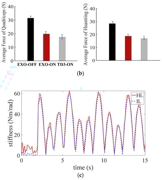The assistance effectiveness of the exosuit. (a) The muscle force during a complete walking gait; (b) the muscle forces of quadriceps and hamstrings under the three conditions; (c) the stiffness profiles of the HL and IL.